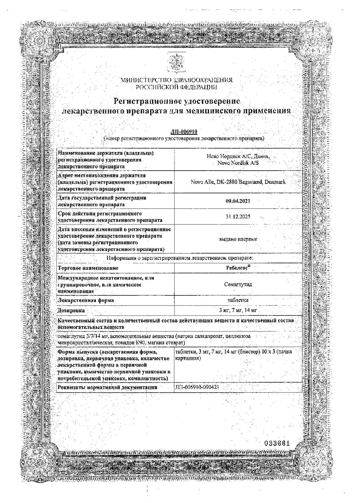 На 26 неделе (первичная конечная точка – анализ данных 731 пациента) терапия препаратом Ребелсас® 3 мг, 7 мг и 14 мг привела к статистически значимому снижению показателя HbA1c на 0,6 %, на 0,9 % и на 1,3 % по сравнению с 0,1 % в группе плацебо (р< 0,0001 для всех доз).