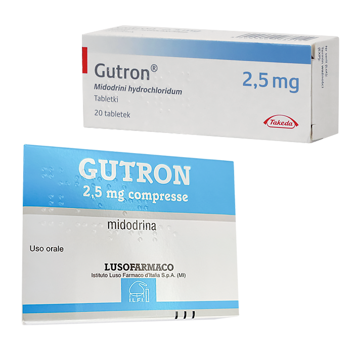 Таблетки по 2,5 (белые) или 5 мг (оранжевые) мидодрина круглой формы имеют маркировку «GU» и «2,5» или «GU» и «5» в соответствии с дозировкой. Таблетки расфасованы в блистеры по 10 шт. Одна упаковка состоит из 20 таблеток.